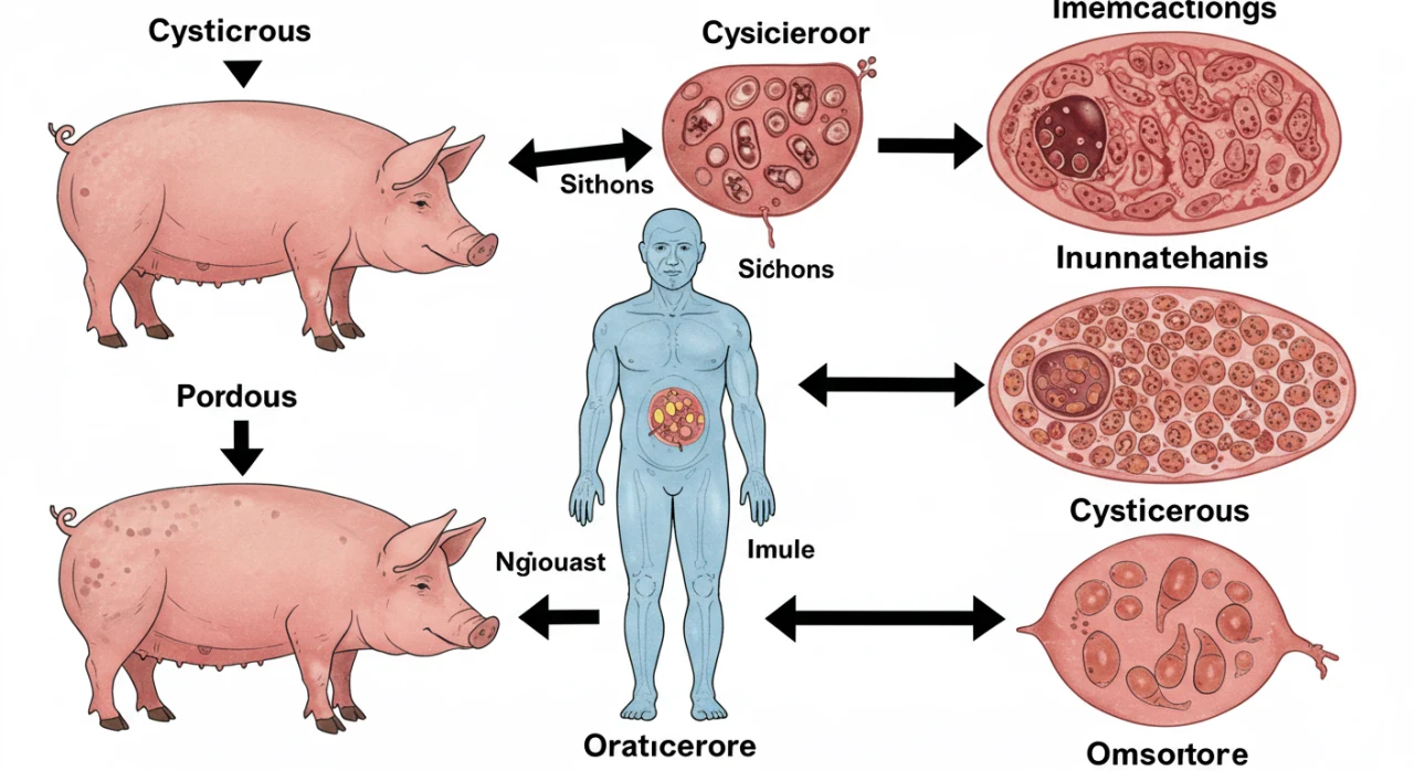 A cisticercose é uma doença causada pela larva da tênia, um parasita que pode ser encontrado na carne de porco. Quando uma pessoa ingere a carne contaminada e mal cozida, os ovos da tênia se desenvolvem em larvas que se espalham pelo corpo, formando cistos em diferentes órgãos, como músculos, olhos e cérebro.