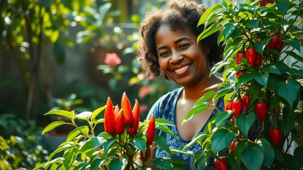 Brasileira conversando com pimenteira saudável. Conexão com a planta.