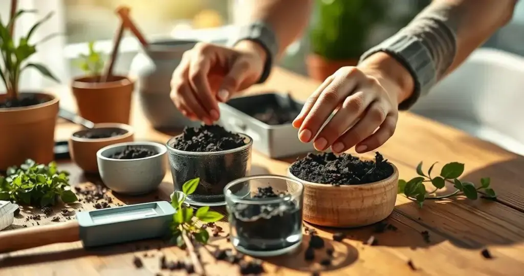 Se sua terra está alcalina demais e você quer baixar o pH, use turfa ou borra de café. A turfa, uma matéria orgânica, ajuda a acidificar a terra devagar. A borra de café, aquela que sobra do nosso cafezinho, também ajuda a baixar a alcalinidade. Vamos combinar: é uma forma sustentável de cuidar do jardim.
